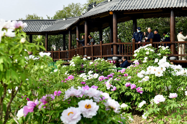 4月8日,在菏澤市曹州牡丹園,盛開的牡丹吸引游客駐足欣賞。 新華社記者 郭緒雷 攝