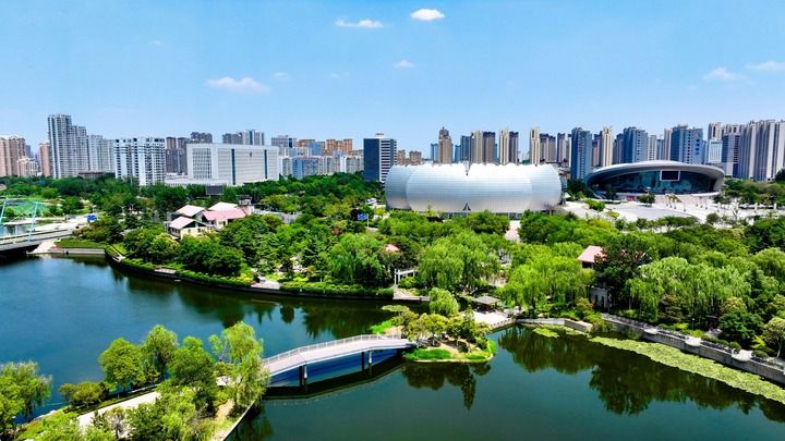 6月21日拍攝的山東省菏澤市趙王河濕地公園及周邊景色(無人機照片)。新華社記者 郭緒雷 攝