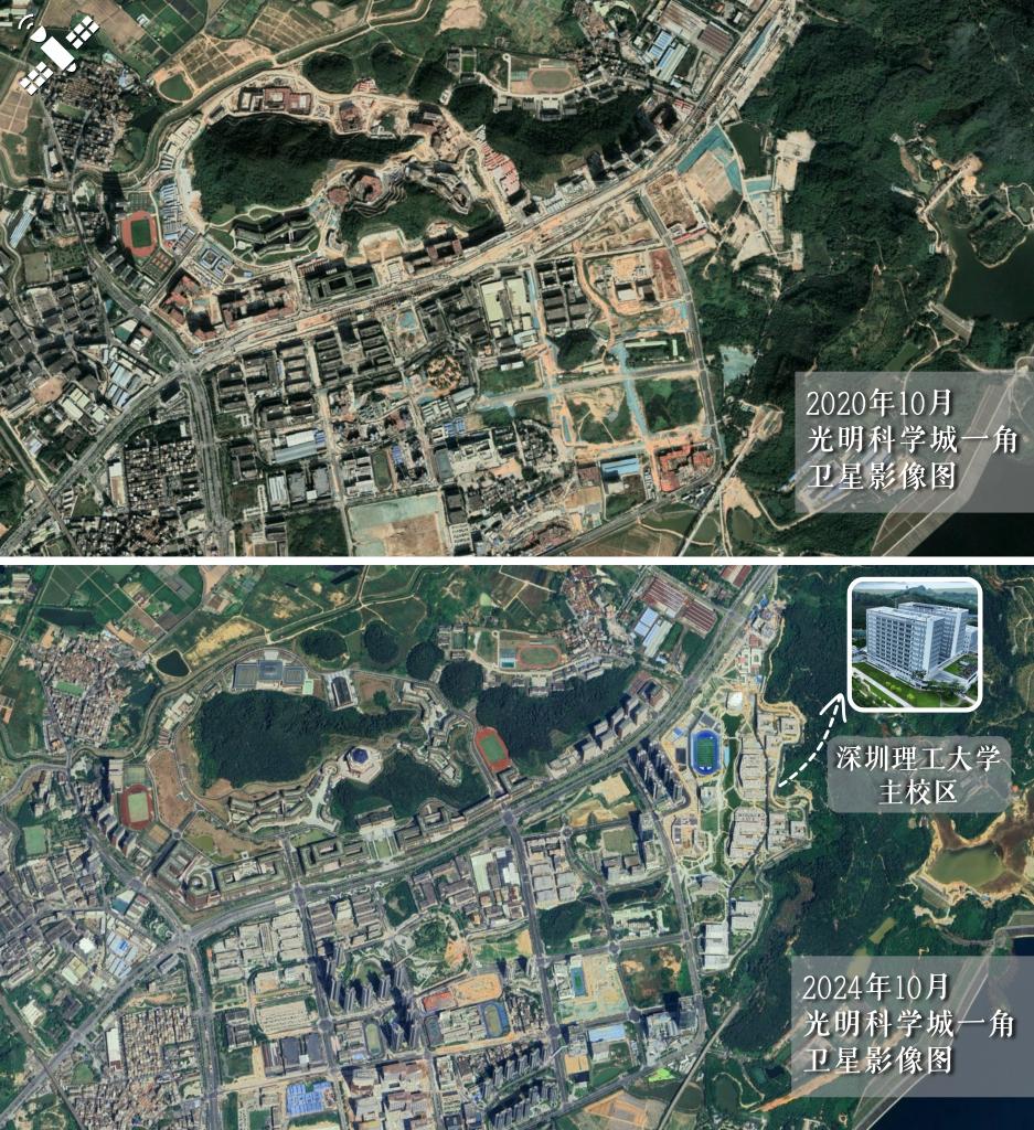 解讀:2024年與2020年相比,位于光明科學城內的深圳理工大學主校區建筑群拔地而起。
