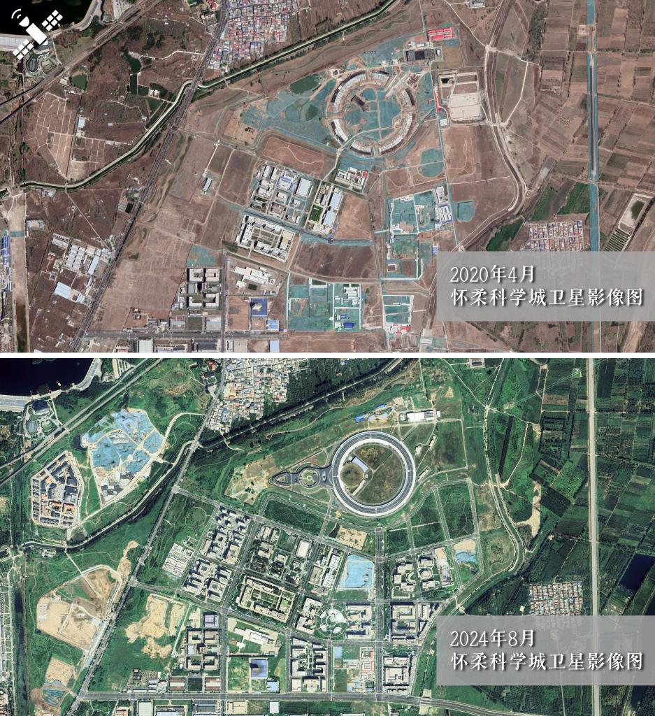 解讀:2020年4月規劃區(上圖)與2024年8月建成區對比(下圖),懷柔科學城大科學裝置布局初現。