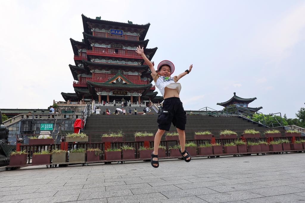 7月7日,一位小朋友在江西南昌滕王閣前躍起留影。