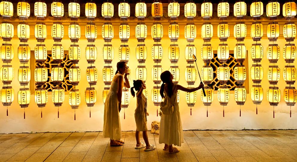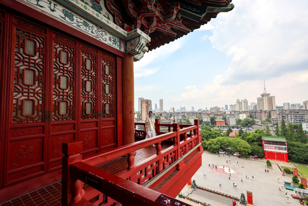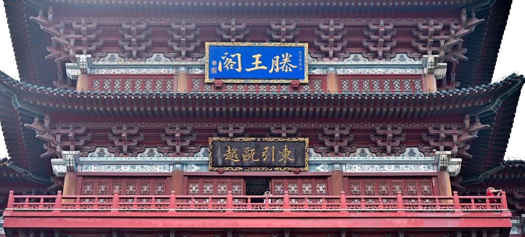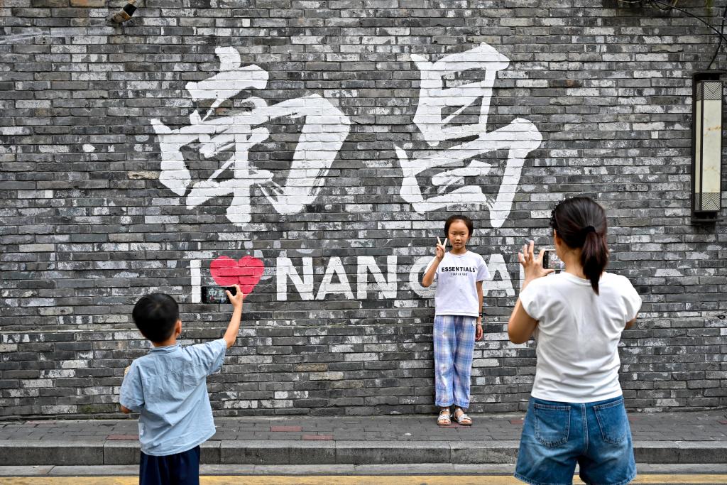 7月7日,游客在江西南昌滕王閣景區附近的半步街打卡留影。