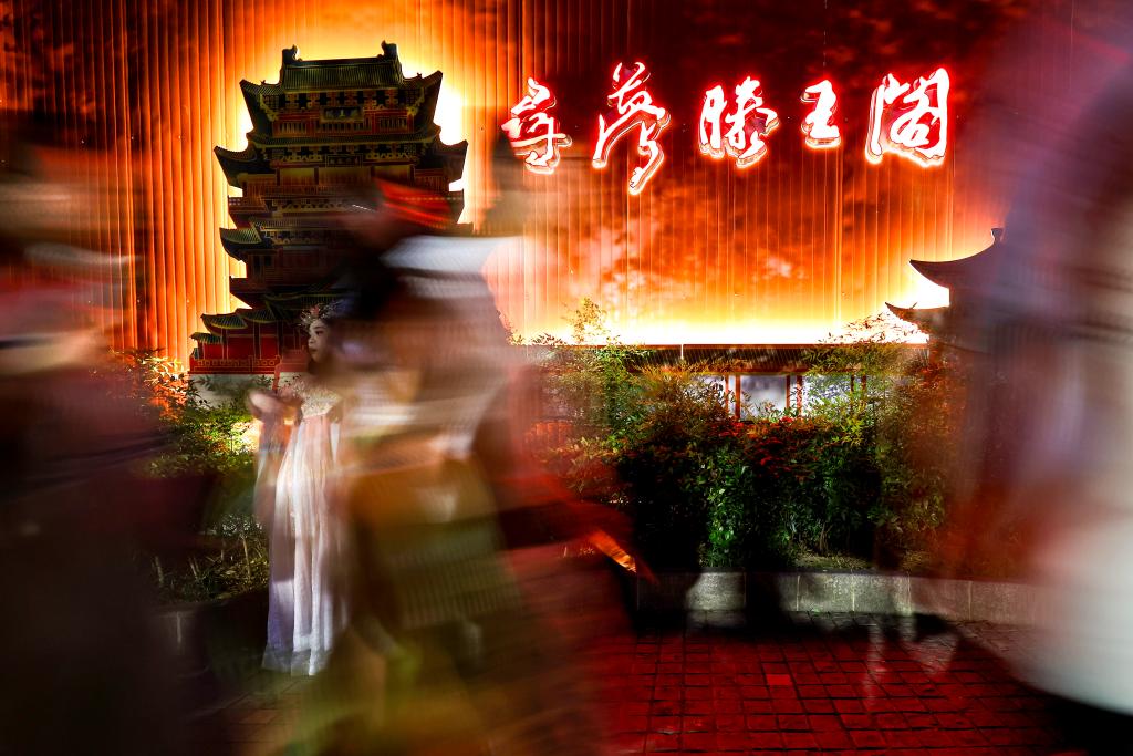 7月7日,游客在夜間游覽江西南昌滕王閣景區。
