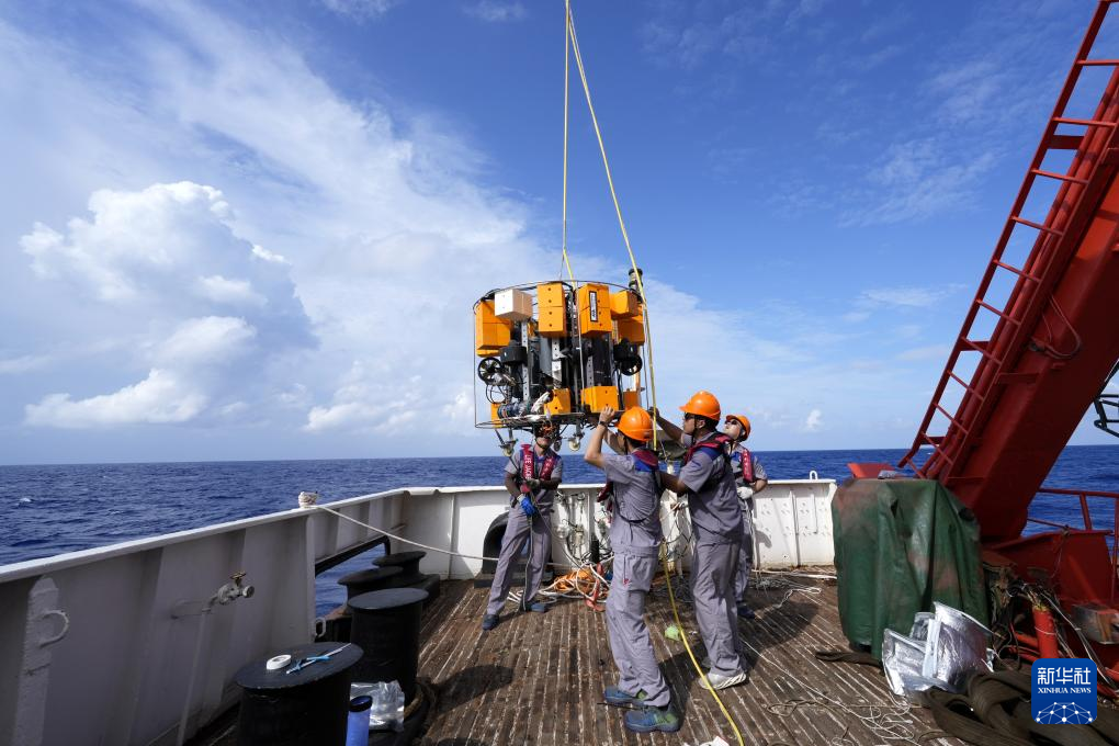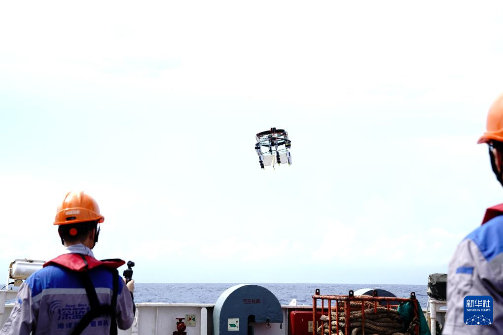 7月8日,科研人員將無人潛器吊運入海開展科考試驗。新華社記者 張建松 攝