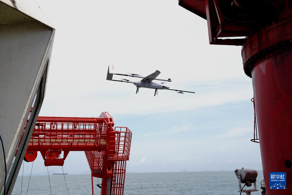 7月8日,熱成像識別檢測無人機從“向陽紅10”號起飛開展科考試驗。新華社記者 張建松 攝