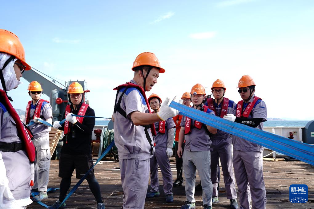 7月8日,“深藍智能i3航次”首席科學家、南方科技大學海洋高等研究院院長、講席教授林間(中)在“向陽紅10”號指導科考安全工作。新華社記者 張建松 攝