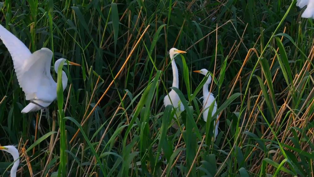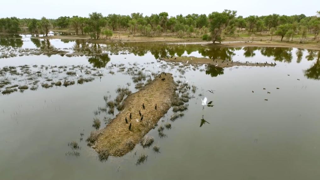 隨著新疆26次向塔里木河下游生態輸水,若羌縣境內的臺特瑪湖碧波蕩漾,白鷺、野鴨等水鳥在湖中嬉戲、覓食,構成了一幅生動而和諧的生態畫卷。