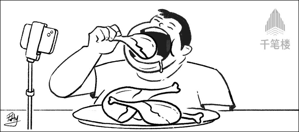 有的主播一言不發就開吃,方便面、肥腸、羊頭、魷魚、乳豬……各種食物一筷接一筷往嘴里送,一碗又一碗向肚里灌。有些主播實在吃不下了,轉身出去吐掉,回來對著鏡頭又接著播。