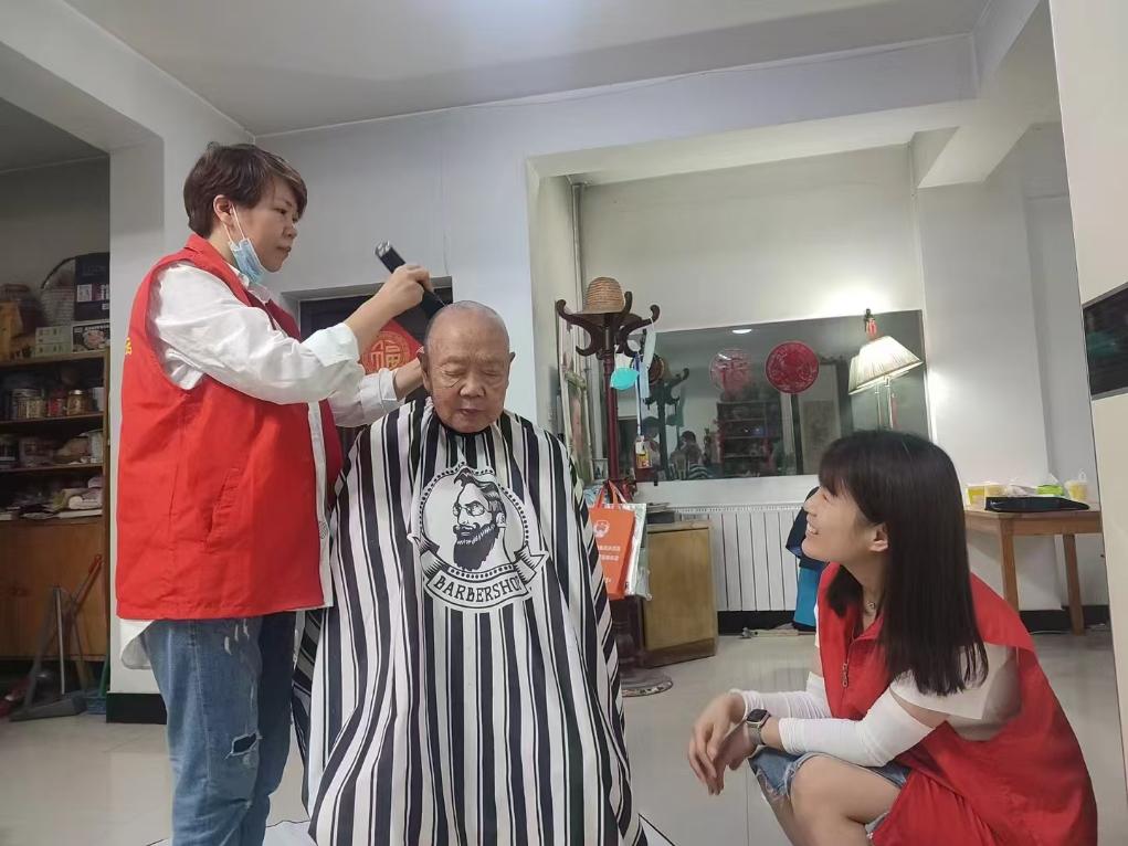 西安市碑林區黃雁社區的工作人員和志愿者上門為留守老人提供剪發服務。(受訪者供圖)