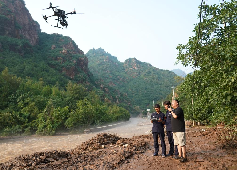 7月28日,救援人員在北京市平谷區鎮羅營鎮操作無人機勘察道路水毀情況。新華社記者張晨霖 攝