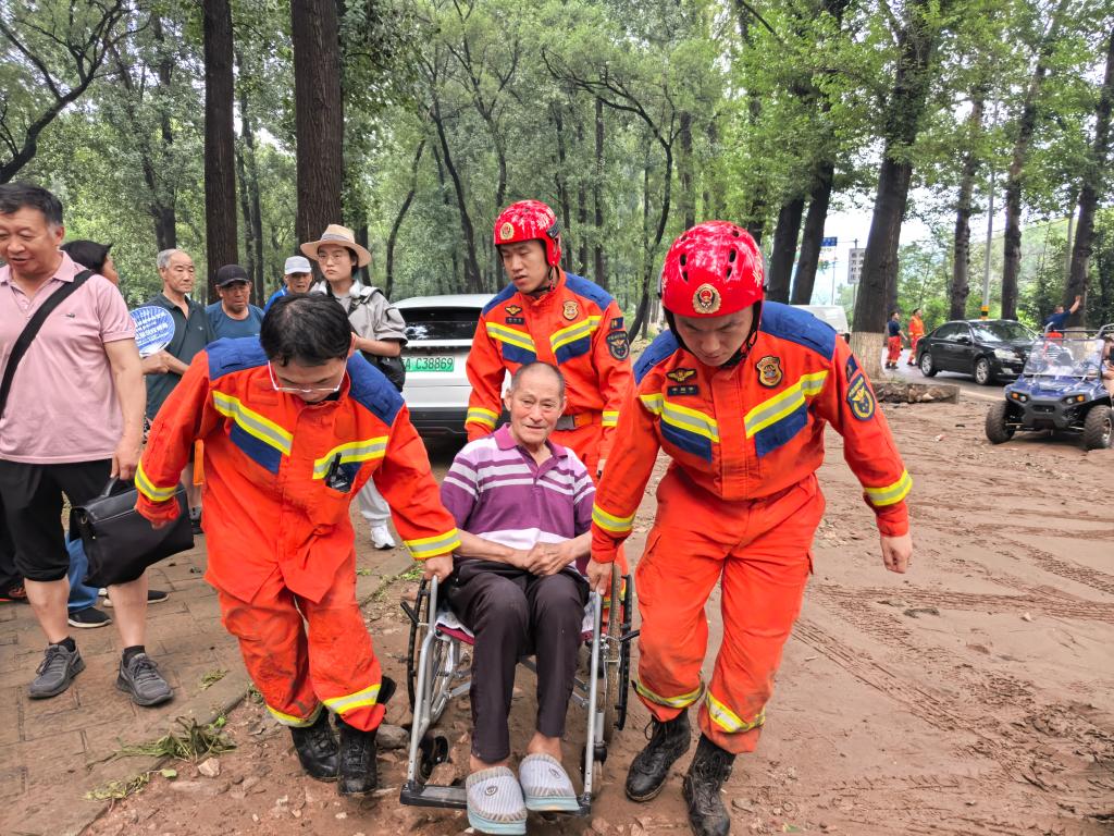 7月28日,救援人員在北京市平谷區鎮羅營鎮轉移群眾。新華社記者 余佩璇 攝