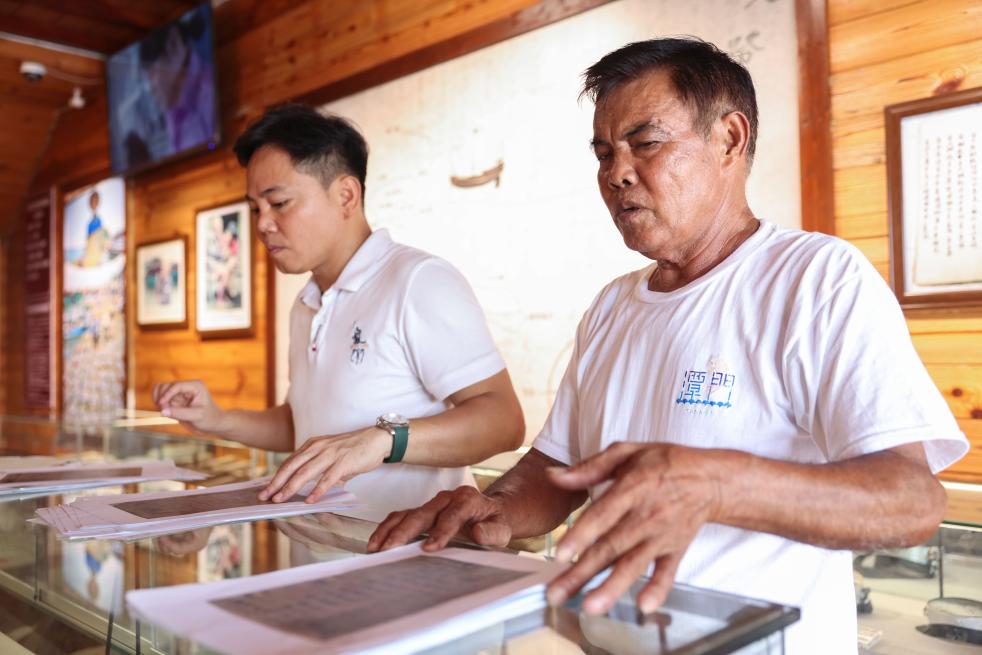 7月22日,在海南省瓊海市更路簿博物館內,王振忠(左)和王書保整理更路簿復印件。