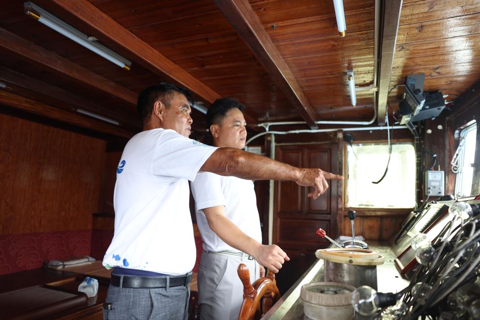 7月22日,在海南省瓊海市,王書保和兒子王振忠站在一艘漁船里看航海設備。