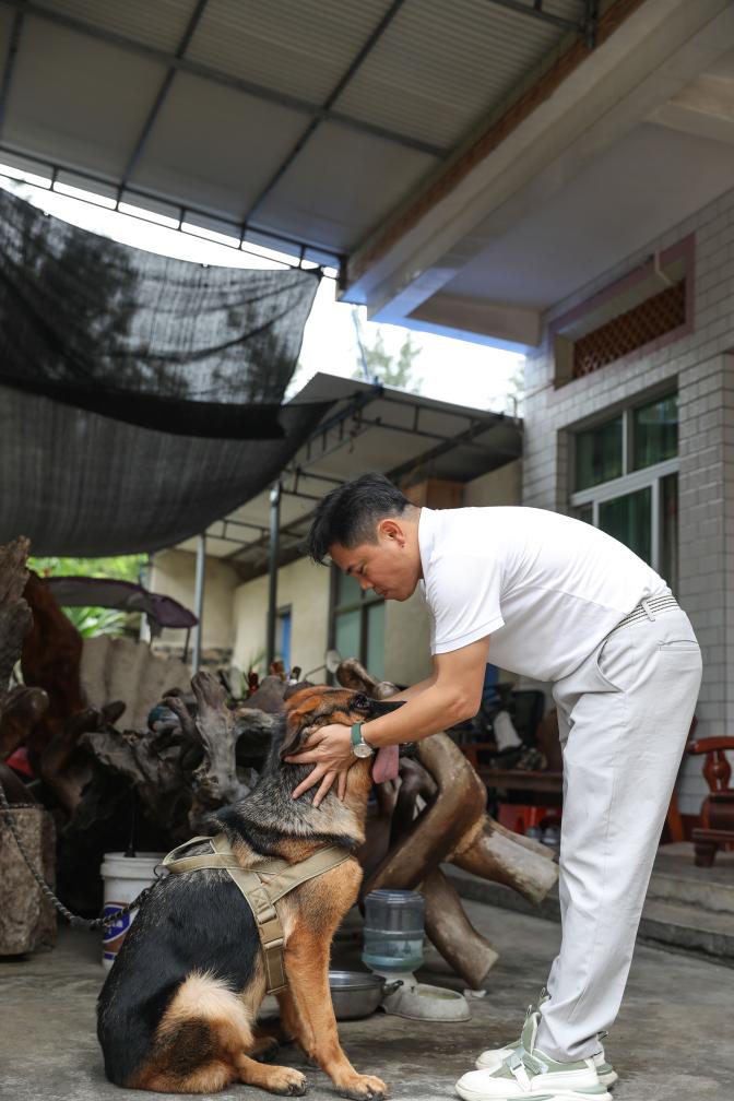 7月22日,在海南省瓊海市潭門鎮,王振忠在父母家中檢查家犬耳朵情況。