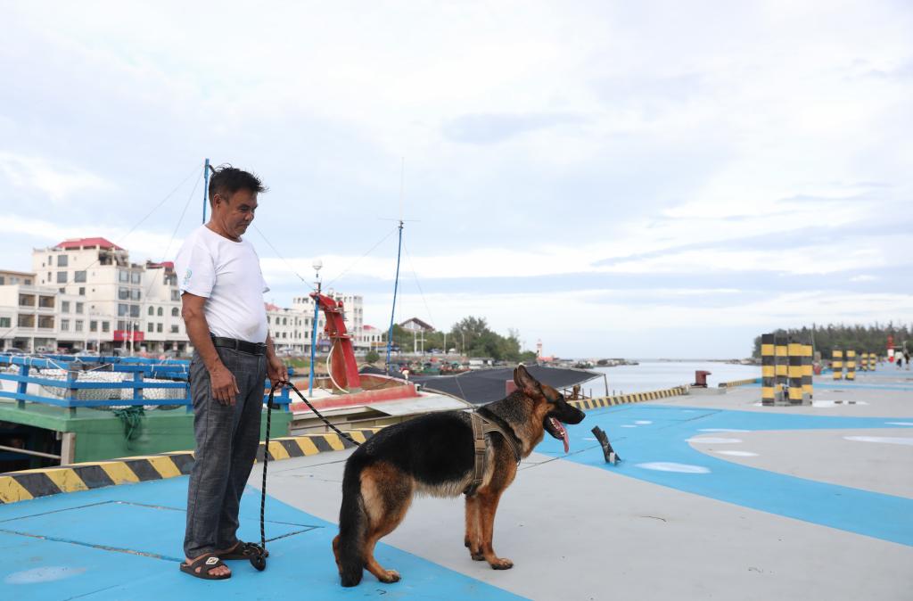 7月22日,在海南省瓊海市潭門鎮,王書保在遛狗。