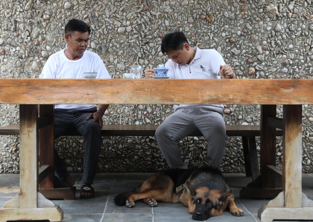 7月22日,在海南省瓊海市潭門鎮,王振忠(右)和王書保在家中喝茶聊天。