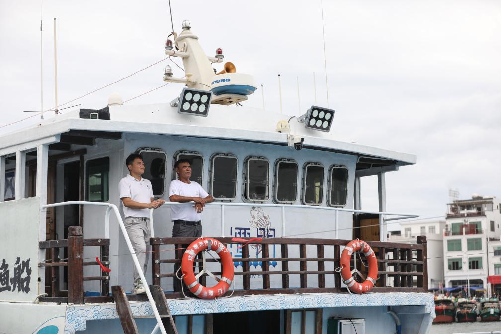 7月22日,在海南省瓊海市潭門鎮,王振忠(左)和王書保在船上遠眺。