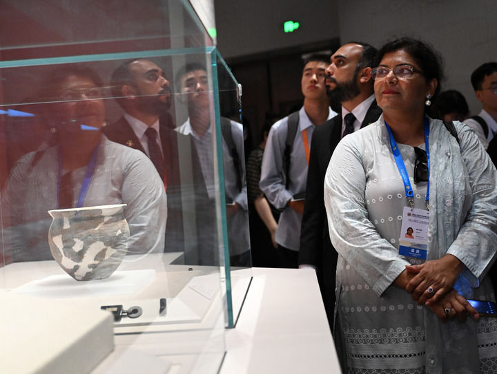 2025年7月24日,上海合作組織媒體智庫峰會子活動“文化遺產保護利用交流合作會”的參會嘉賓在鄭州大河村遺址博物館新館參觀。新華社記者 李嘉南 攝