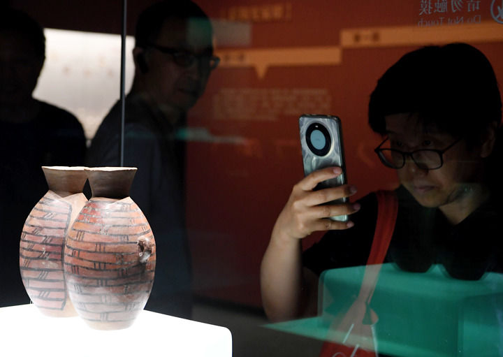 2025年6月14日,參觀者在大河村遺址博物館新館內拍攝展品彩陶雙連壺。新華社記者 郝源 攝
