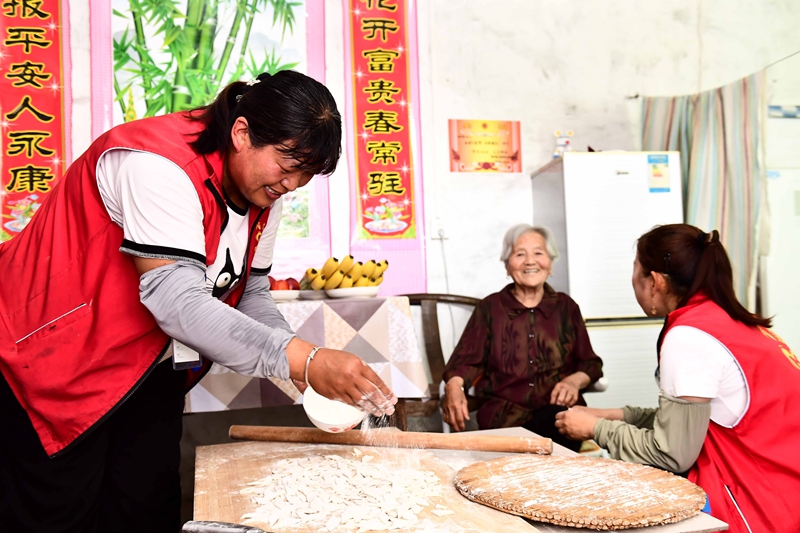 菏澤市鄆城縣唐塔街道宋屯村,居家養老服務中心的工作人員上門為92歲老人服務。 新華社記者 郭緒雷 攝