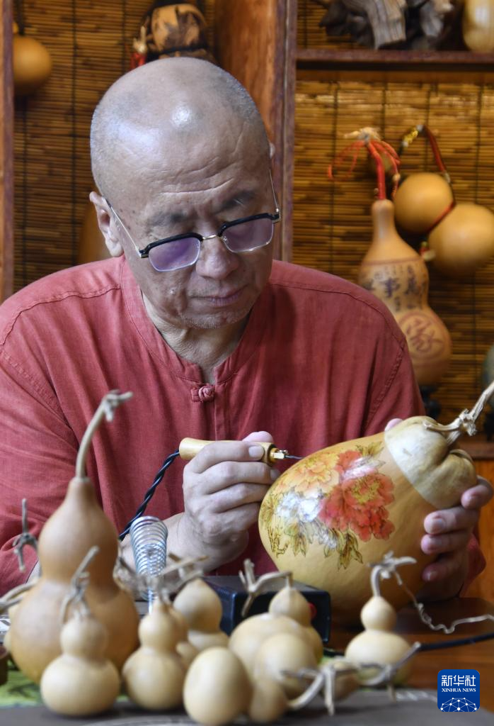 在懷柔區橋梓鎮禧寶露文化中心,懷柔區非物質文化遺產焦家浸烙葫蘆代表性傳承人焦宇在烙制葫蘆(8月6日攝)。