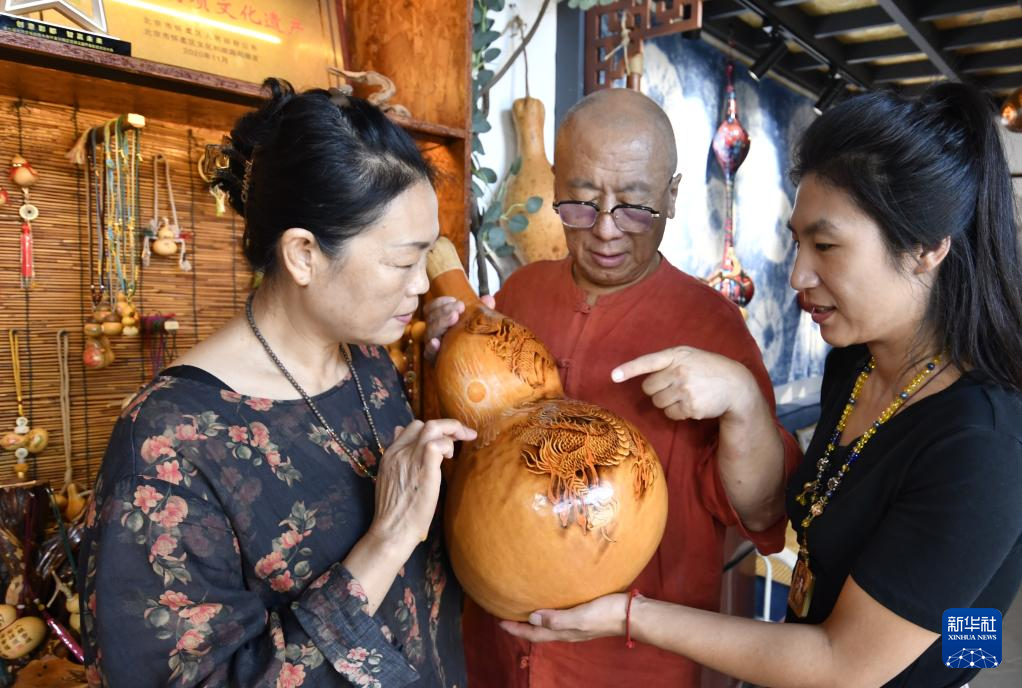 在懷柔區橋梓鎮禧寶露文化中心,懷柔區非物質文化遺產焦家浸烙葫蘆代表性傳承人焦宇(中)為來賓講解烙制葫蘆的技藝(8月6日攝)。