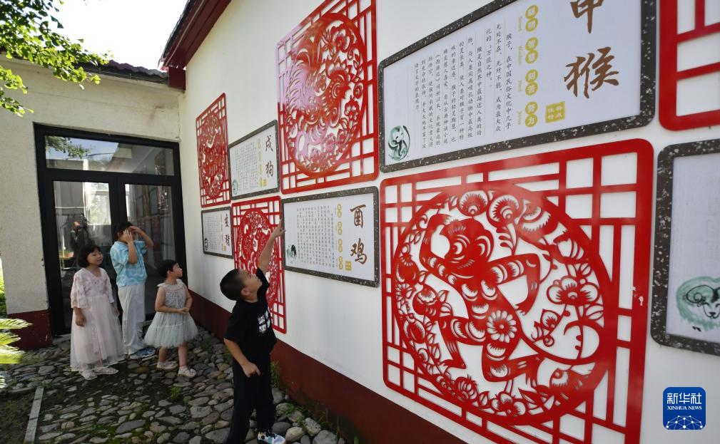 在懷柔區橋梓鎮禧寶露文化中心,孩子們觀看剪紙技藝十二生肖墻(8月6日攝)。