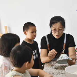在懷柔區橋梓鎮禧寶露文化中心,陶瓷鋦補技師張鳳琴(右二)為周邊村里的孩子上暑期傳統文化課(8月6日攝)。
