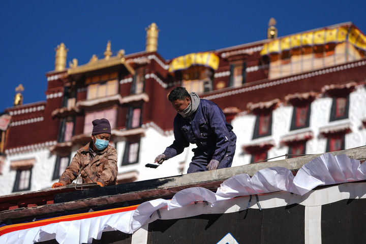布達拉宮管理處維修科工作人員在粉刷墻體(2024年12月4日攝)。新華社記者 晉美多吉 攝