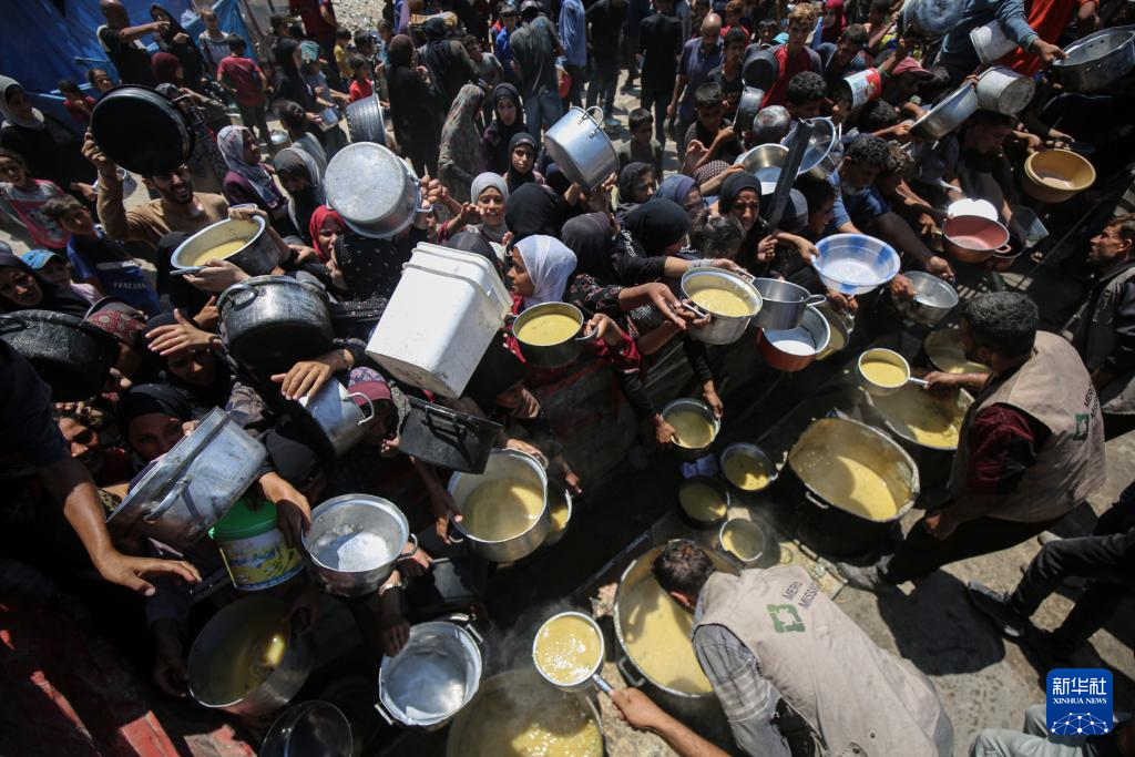 8月2日,流離失所的巴勒斯坦人在加沙城等待領取食物。新華社發(里澤克·阿卜杜勒賈瓦德攝)