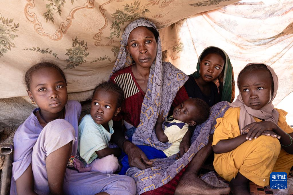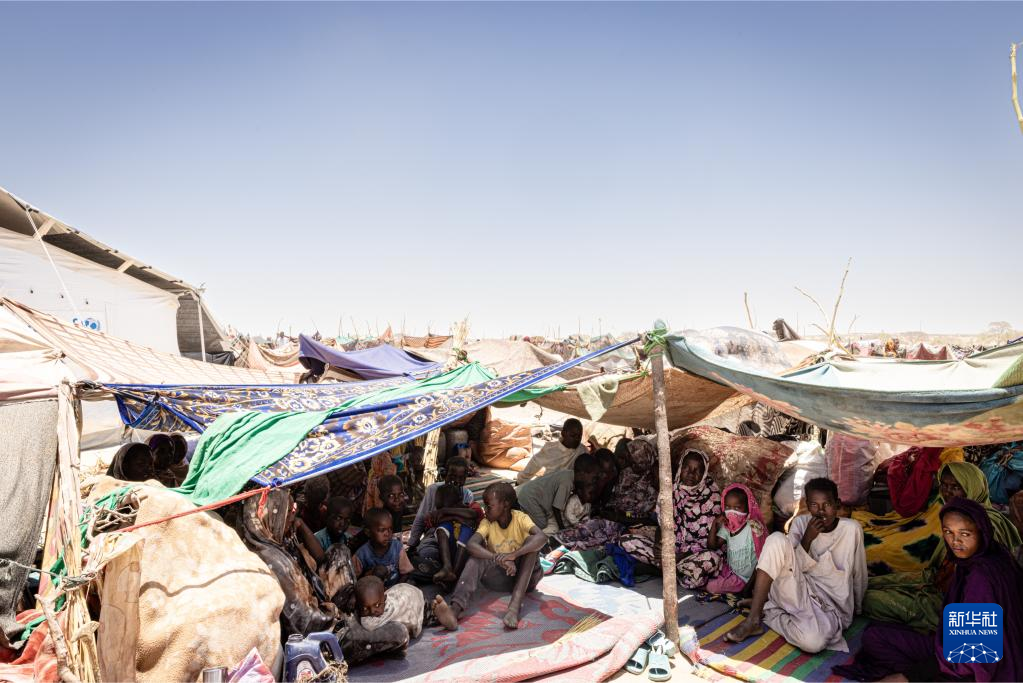 8月8日,在蘇丹北達爾富爾州塔維拉鎮,流離失所的婦女和孩子坐在用樹枝和破布搭建的簡陋帳篷下。新華社發(世界糧食計劃署供圖)