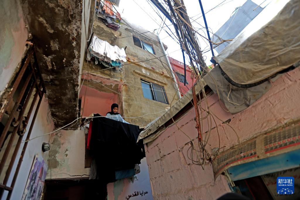 8月14日,在黎巴嫩貝魯特附近的一處巴勒斯坦難民營中,一名女孩在晾曬衣物。新華社發(比拉爾·賈維希攝)