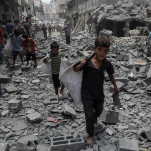 8月8日,孩子們在加沙城以軍襲擊后的廢墟上搬運物品。新華社發(里澤克·阿卜杜勒賈瓦德攝)