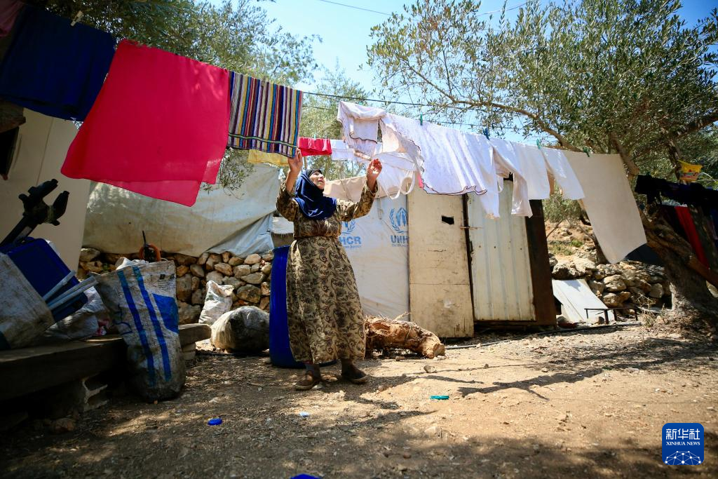 8月14日,在黎巴嫩凱泰爾邁耶難民營,流離失所的敘利亞婦女在一處難民營晾衣服。新華社發(阿里·哈希紹攝)
