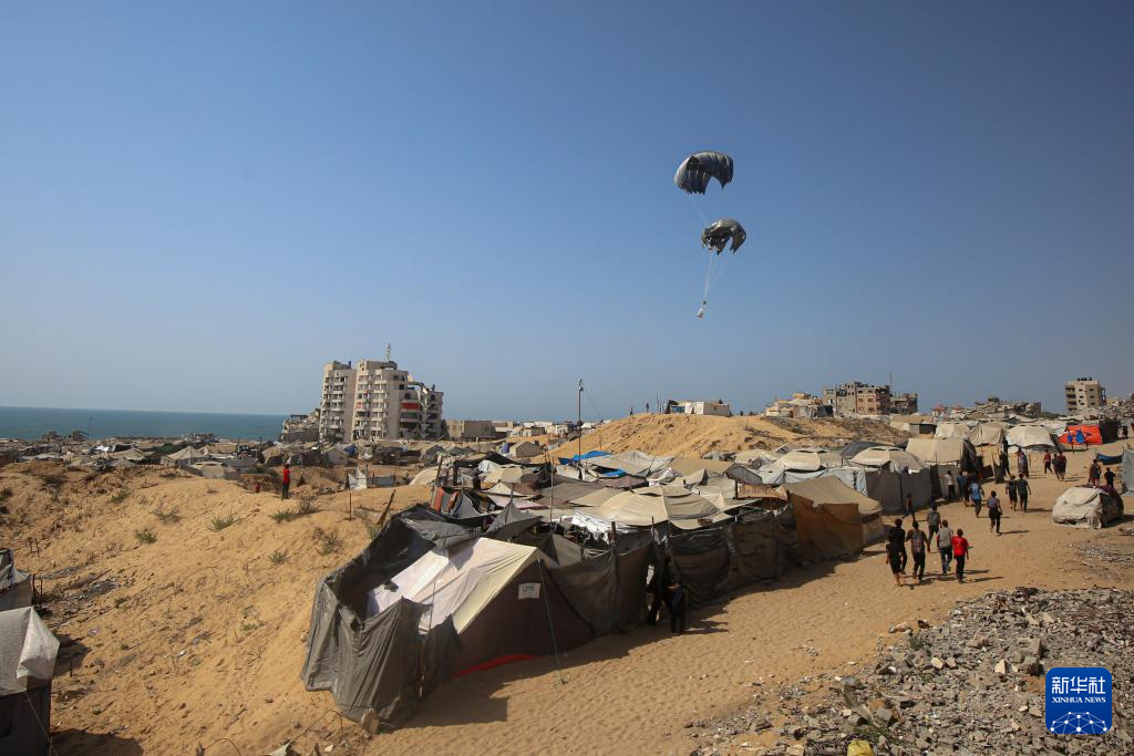 這是8月15日拍攝的加沙城上空的空投物資。新華社發(里澤克·阿卜杜勒賈瓦德攝)