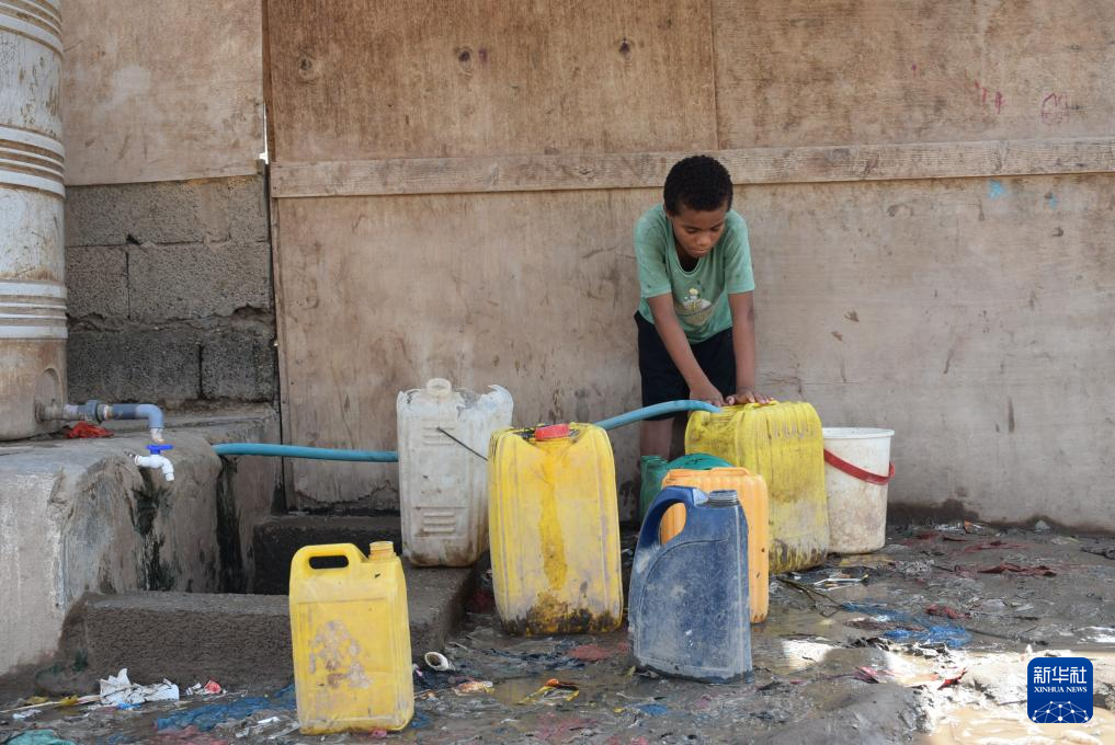 8月11日,在也門亞丁郊區的一個流離失所者臨時安置營地,一名男孩從水箱灌裝飲用水。新華社發(穆拉德攝)