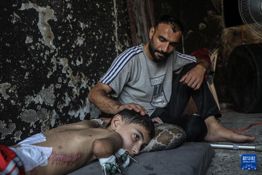 8月14日,薩米爾·扎庫特和家人在加沙城的家中,11歲的巴勒斯坦兒童薩米爾·扎庫特在以軍空襲中失去了右臂和左腿,造成永久殘疾。新華社發(里澤克·阿卜杜勒賈瓦德攝)