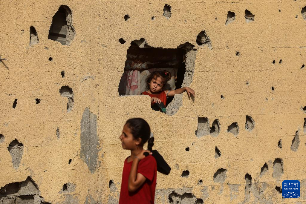 這是8月14日在加沙城的海邊拍攝的流離失所的巴勒斯坦兒童。新華社發(里澤克·阿卜杜勒賈瓦德攝)