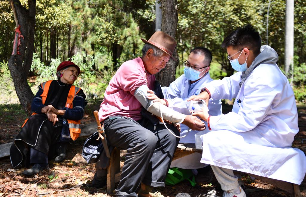 2023年6月12日,廣東援藏醫生王振疆(右二)和本地醫生尼瑪益西(右一)在西藏米林市吞布容村,給村民普布多吉檢查身體。 新華社記者 晉美多吉 攝