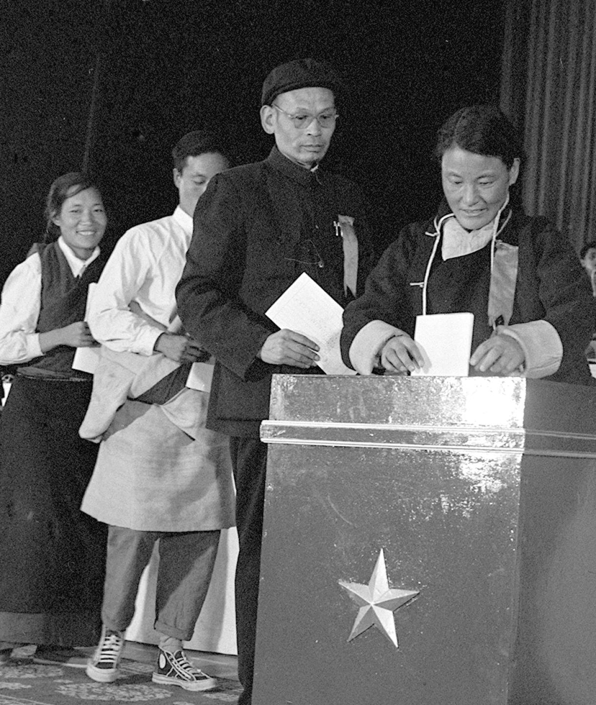 1965年9月,西藏自治區第一屆人民代表大會第一次會議的代表次仁拉姆(右一)正在投票。新華社記者袁克忠攝