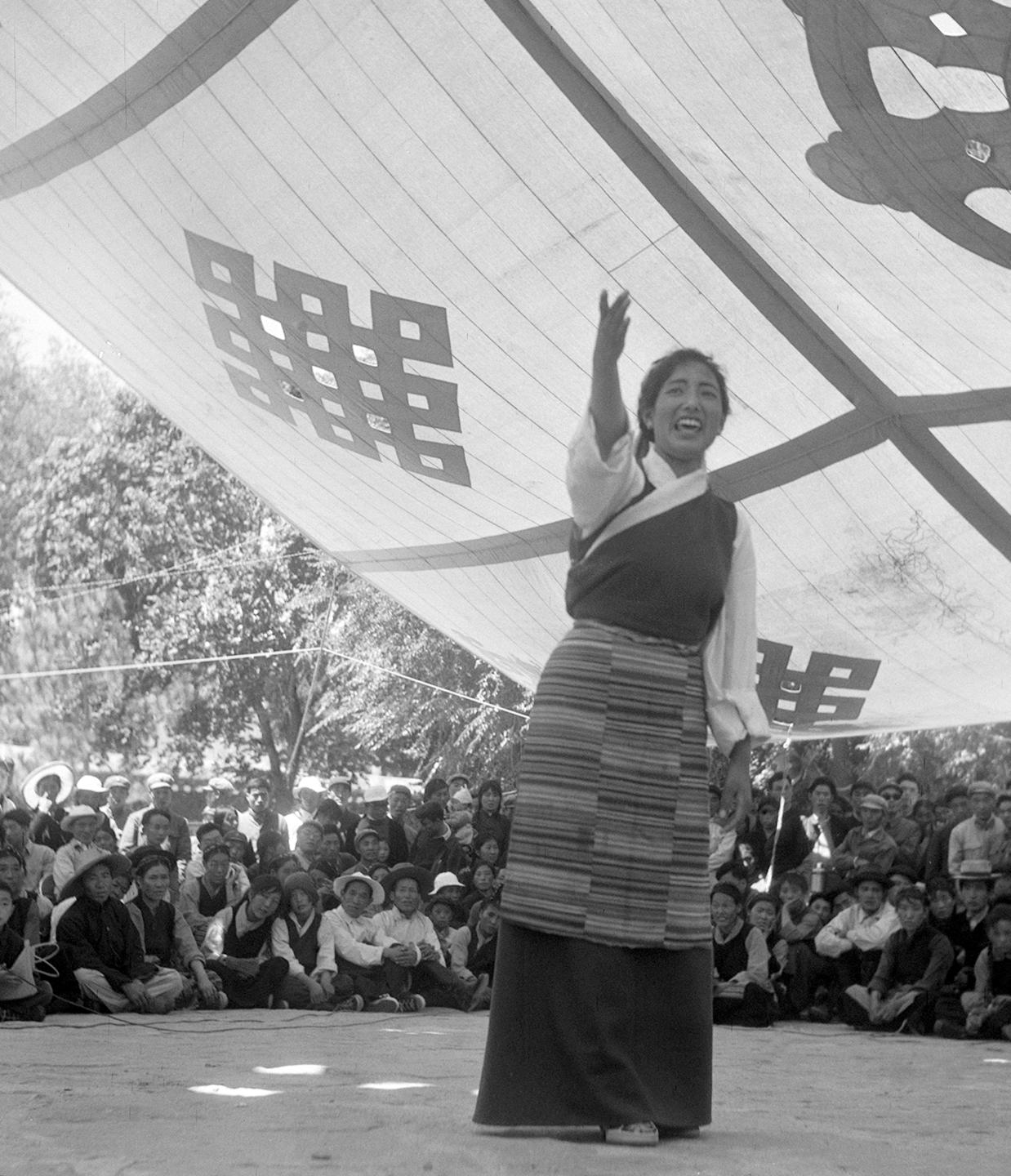 1965年10月,在西藏拉薩各族各界群眾慶祝自治區成立聯歡會上,西藏文化工作隊隊員雍西在演出。新華社記者 林楓 攝