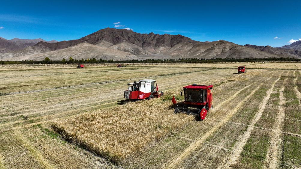 2022年9月19日,西藏日喀則市江孜縣熱索鄉努康村農機合作社的村民集中對村里三千多畝耕地進行機械化收割。新華社記者 晉美多吉 攝