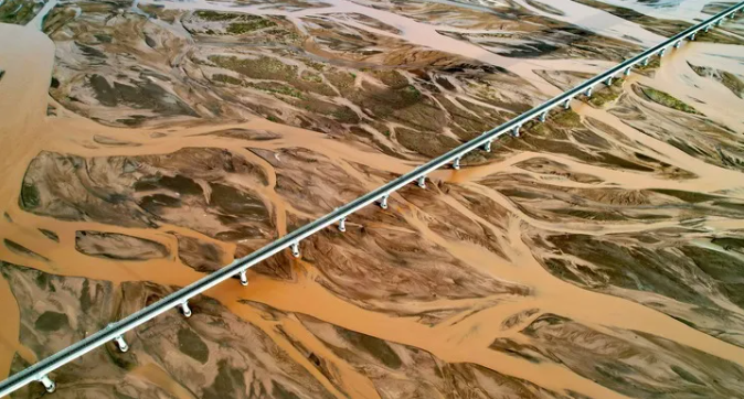 青藏鐵路跨過沱沱河的辮狀河道(2023年7月26日攝,無人機照片)。新華社記者 劉詩平 攝