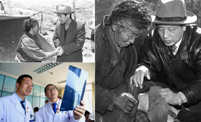 左上圖為來自陜西的援藏干部、阿里日土縣副縣長賈冗勇深入牧區,幫助藏族牧民解決生產、生活的實際困難(新華社記者土登攝,1997年11月11日發);左下圖為2017年8月3日,北京積水潭醫院援藏醫生龔曉峰(右)和北京天壇醫院援藏醫生李家謀在拉薩市人民醫院骨科病房內查看患者的X光片(新華社記者晉美多吉攝);右圖為孔繁森(右)在阿里日土縣過巴鄉為孤寡老人益西卓瑪治?。ㄐ氯A社記者土登攝,1994年12月26日發)。
