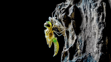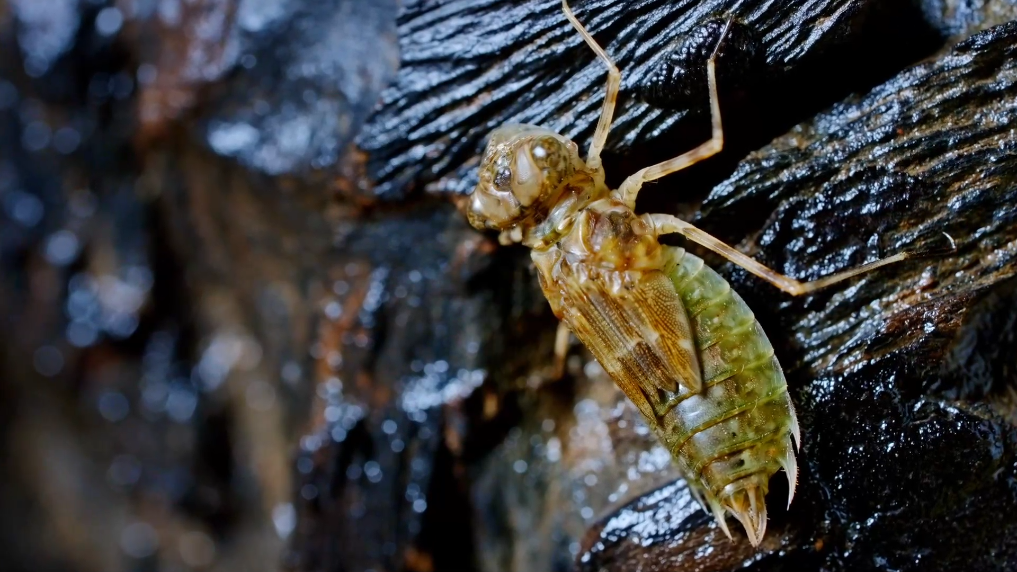 初秋時節,云南省昆明市滇池南岸迎來蜻蜓羽化高峰期。水蠆,即蜻蜓的幼蟲,凌晨爬上水面附近的植物莖稈、巖石或堤岸,牢牢固定身體,靜候蛻變。延時攝影下,其背部緩緩裂開,新生軀體奮力掙脫舊殼,完成生命轉折。翅膀與身體在夜露和微風中逐漸舒展、挺立、硬化,翅脈清晰,薄翼如紗。天色漸亮,蜻蜓完成羽化,化身空中獵手,開啟新的生命旅程。