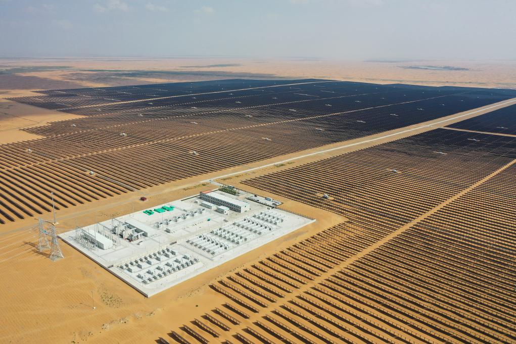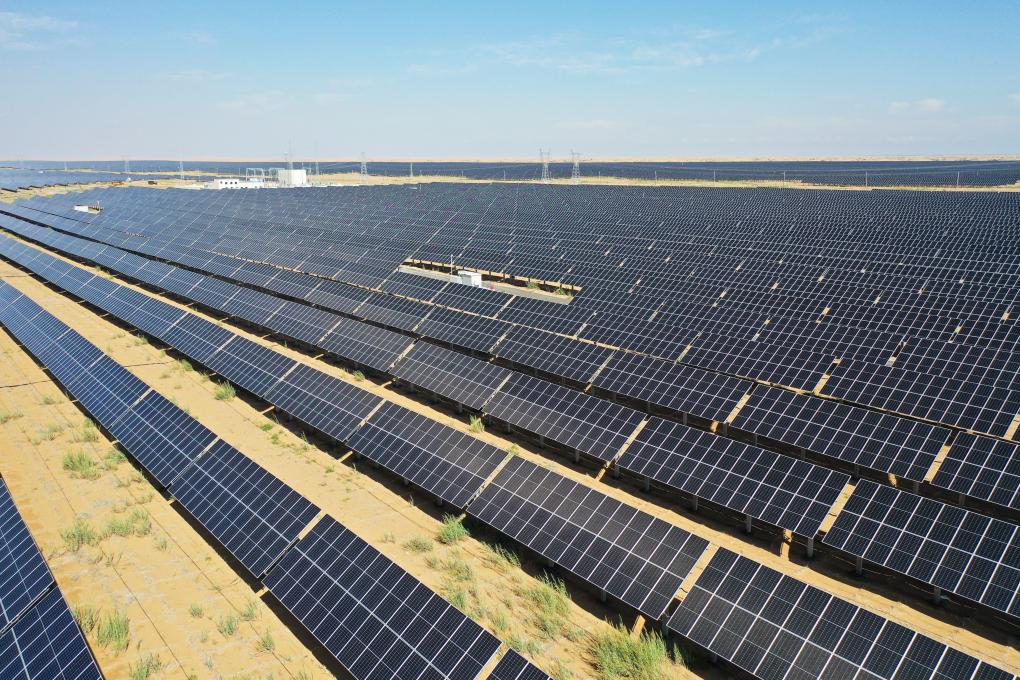 沙漠深處,一張張藍色光伏板如波浪般向天際延伸,它們靜靜地吸收著炙熱的陽光,將不毛之地變成巨大的“綠色電站”。