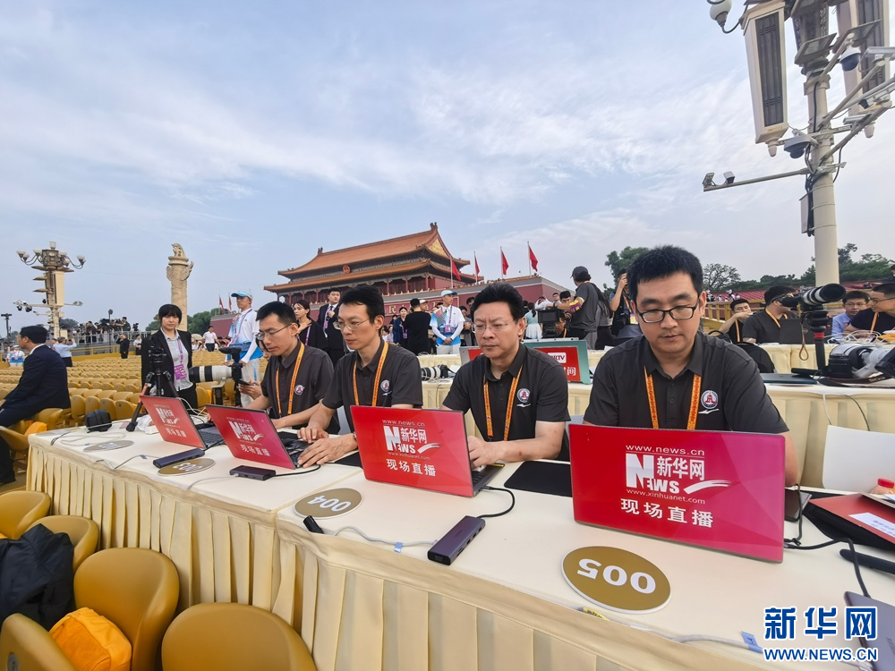 新華網直播團隊在紀念大會現場進行直播準備-新華網