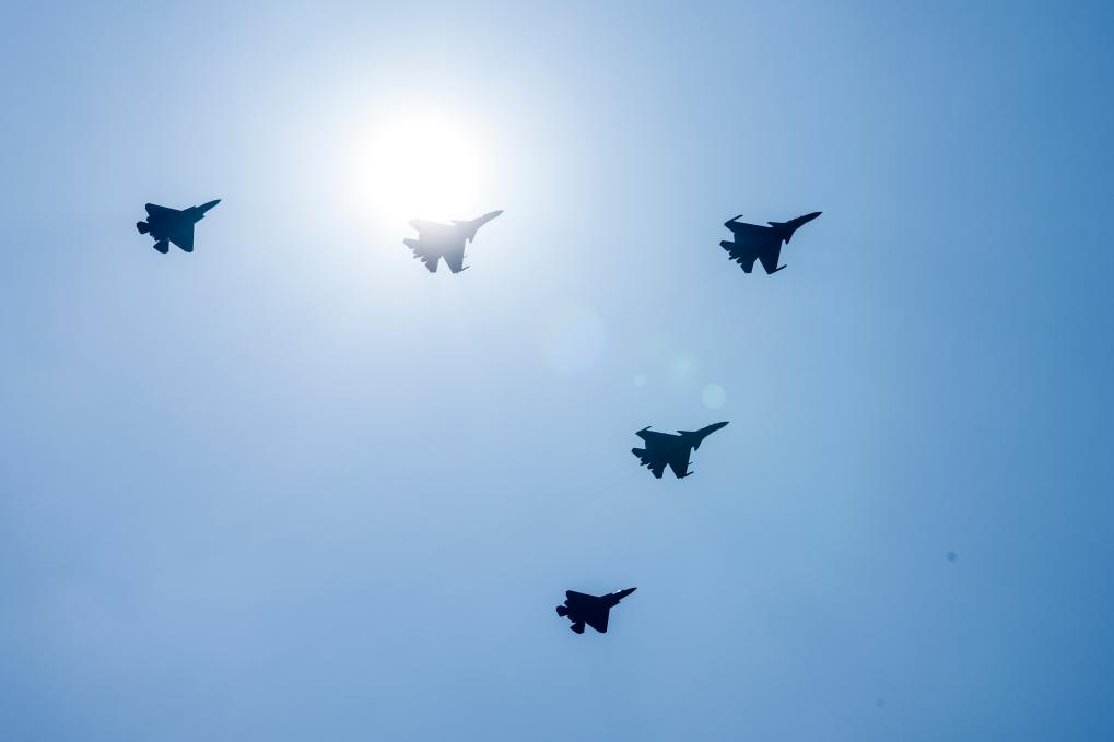 9月3日,紀念中國人民抗日戰爭暨世界反法西斯戰爭勝利80周年大會在北京隆重舉行。這是殲擊機梯隊從北京城區上空飛過。新華社記者 白雪騏 攝