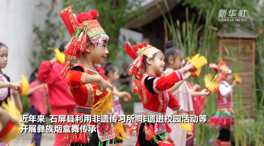 它起源于彝族先民的生產生活,在石屏縣民間廣泛流傳,深受喜愛。石屏縣利用非遺傳習所、非遺進校園活動等開展彝族煙盒舞傳承。