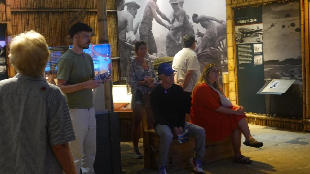 不僅如此,“通往東京之路”展覽,還以多媒體方式突出展示了飛虎隊和駝峰航線:天花板上懸吊著一架修復后的飛虎隊P-40戰鷹戰斗機,機頭繪著鯊魚嘴,而館方獨具匠心的設計,讓參觀者在仰望戰機時,恰巧能看到其下巨大的三聯電子屏幕上,一架C-47運輸機在鯊魚嘴下飛越喜馬拉雅雪山。展廳說明中寫道,中緬印戰區迫使日軍在亞太戰爭的第二條戰線上作戰,具有至關重要的戰略意義——11個日軍師團在島嶼和海上與美軍作戰時,還有多達40個師團(近100萬日軍)被困在中國的中日戰爭中。